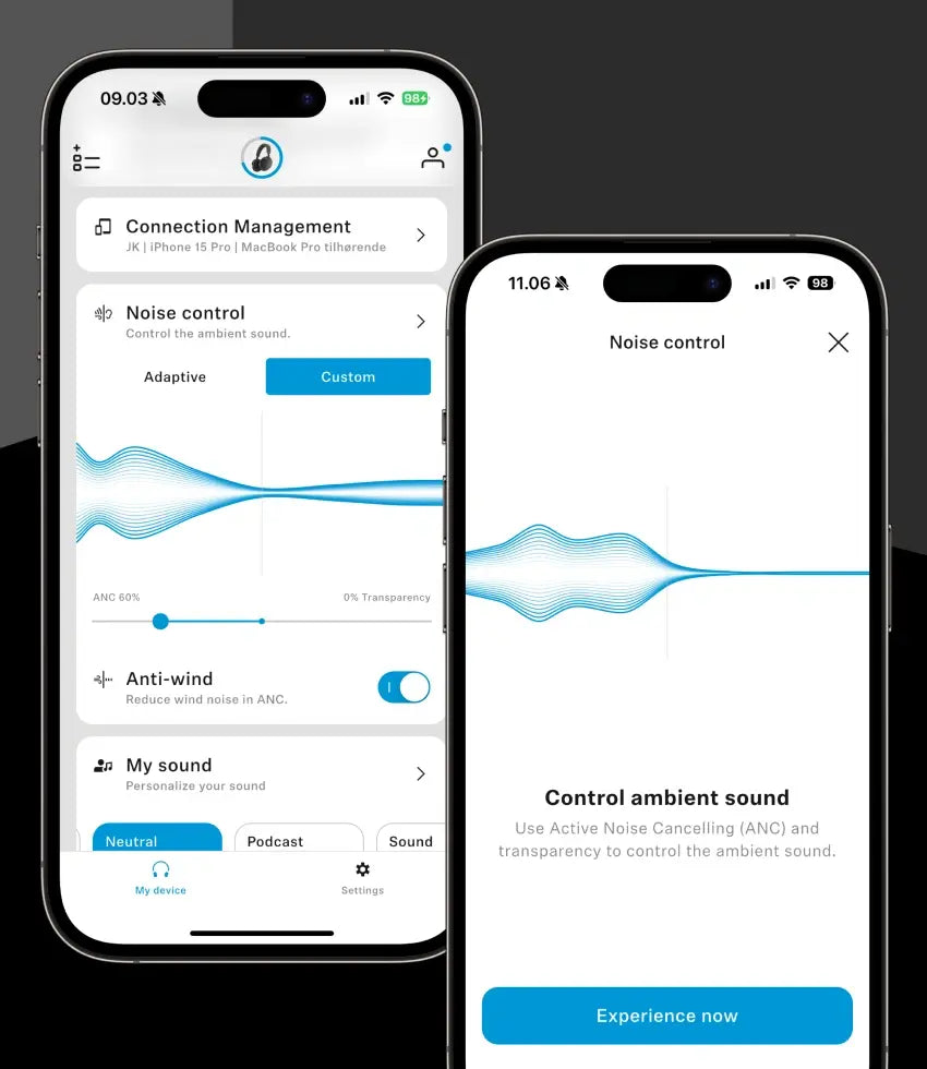 Intuitiv adgang til støjreduktion og transparensfunktion. Uanset om du vil lukke lyden ude eller lukke lyden ind – og i hvilket omfang – har du det hele lige ved hånden.