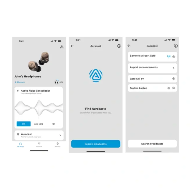 Oavsett om det handlar om att dela en spellista i parken, slå på ljudet på en TV på en sportbar för att lyssna på kommentaren till en sportmatch eller höra ett meddelande vid flygplatsens gate, gör Auracast™ broadcast audio det enkelt att lyssna på personlig nivå med till exempel trådlösa öronsnäckor.